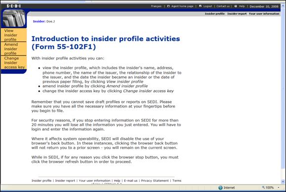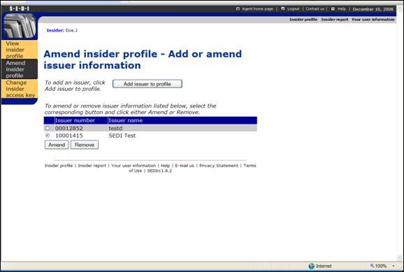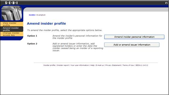 Begin amending the insider profile as described in How to Amend Insider Profile Add or Amend Issuer Information Including Ceasing to be an Insider. Note that this is not an exhaustive procedure for amending an insider profile. Individual circumstances may vary. Only selected screens in the filing process, that are also the same for both insiders and agents, are displayed below. |