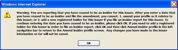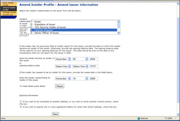 Enter the date the insider ceased to be an insider in the Date the insider ceased being an insider of this issuer field. Confirm in advance that this is the correct date and that the insider has in fact ceased to be an insider of the issuer. For example, if the insider has two relationships to the issuer such as senior officer and director, and is now no longer a director, you would amend the relationship to the issuer list to remove director and keep senior officer. The insider has not ceased to be an insider. Click optional information boxes, if checked, where no amendment is required to the additional contact information or registered holder list. Click Next. SCREEN: Amend insider profile Amend issuer information