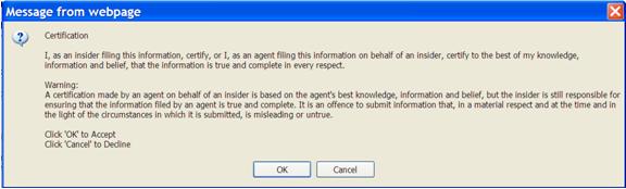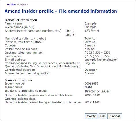 Ensure the information you have entered is correct. You cannot amend a date ceased after certification is accepted. Scroll down, if necessary, and click Certify. SCREEN: Amend insider profile File amended information