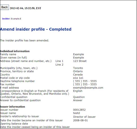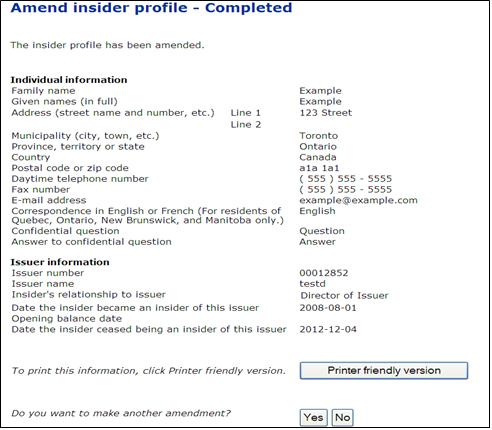 Print the amended insider profile by selecting Printer friendly version and using your browsers print dialog box. Click Back to exit the printer friendly screen.